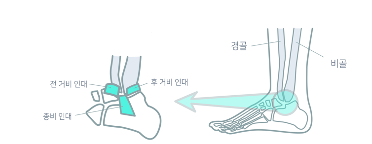 스포츠 활동이나 계단, 바닥을 헛 디뎌 발목이 꼬이거나 접질려 발목관절이 정상 운동범위를 벗어나면서 발생하게 됩니다. 발목관절의 위쪽은 경비인대, 바깥쪽은 종비인대, 전거비인대, 후거비인대, 발목은 안쪽은 삼각인대가 발목에 안정성을 제공하고 있으며 그 중 종비인대와 전거비인대가 발목염좌 시 가장 많이 손상되는 인대입니다.