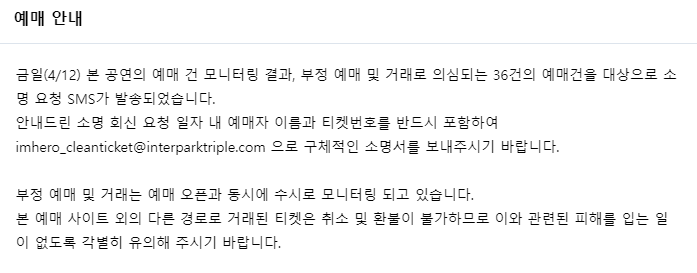 인터파크 공지에 따르면 부정예매 및 거래로 의심되는 36건의 예매건을 대상으로 소명을 요청한 상태라고 하는데요. 잘못된 방식으로 티켓팅을 한 표라면 취소될 확률이 높으므로 취소표 예매의 기회가 올 수도 있습니다.