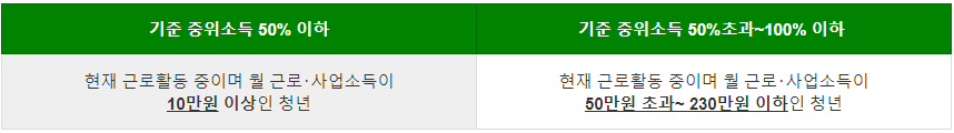 기준 중위소득 50% 초과~100% 이하이고 만 19세 이상~만 34세 이하이면서 월 50만 원 초과~ 월 230만 원 이하의 소득이 있는 경우 매월 10만 원씩 지원이 됩니다.