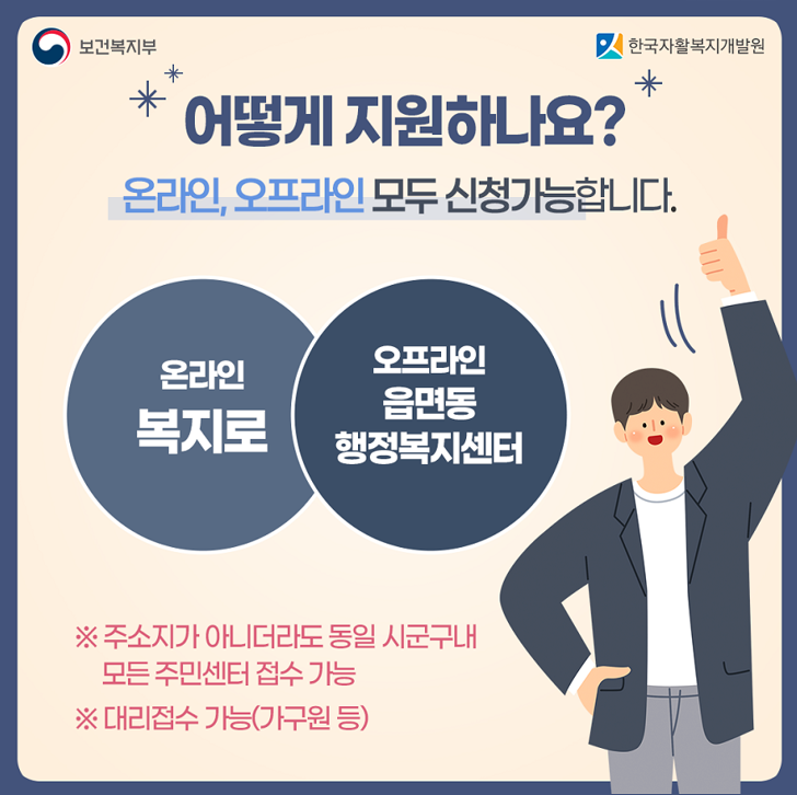 신청방법은 복지로 홈페이지에서 신청하는 방법과 주민센터를 직접 방문해서 신청하는 방법이 있습니다.