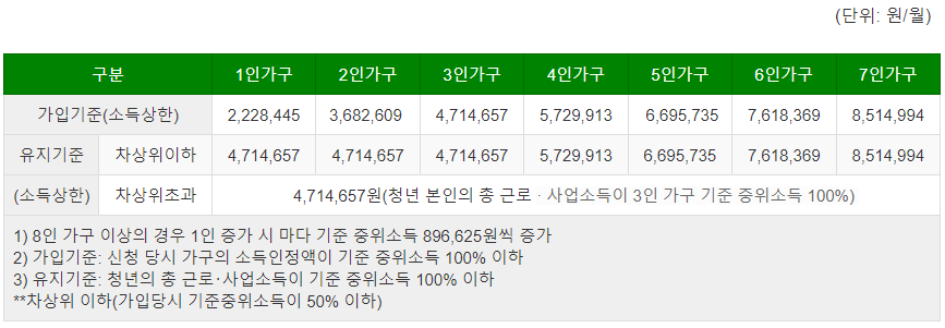 계좌 가입 후에 소득이 늘어날 수 있는데요. 청년내일저축계좌 가입 후 계좌 유지를 위한 소득 상한 기준은 1인가구를 기준으로 했을 때 4,714,657원까지 계좌유지가 가능합니다.